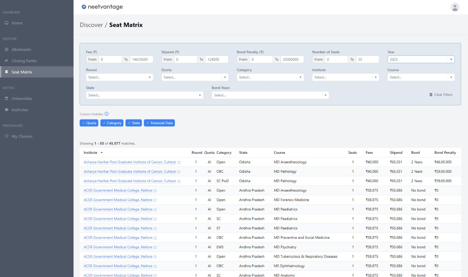 See real-time seat availability by category and quota, helping you prioritize the right institutions.